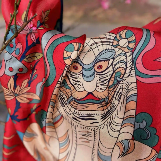 The traditional Vietnamese patterned silk scarf showcases folk tales, traditional artworks, or simply the diverse and colorful flora of Vietnam. The silk scarf is hand-dyed or printed using various roots and leaves (such as tropical almond leaves, turmeric roots, and brown roots) with a natural, warm, and gentle color palette that is environmentally friendly.
