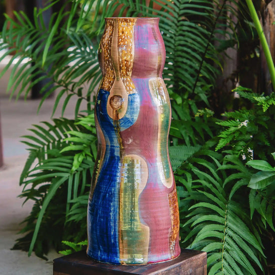 The unique shape of the ceramic vase “Fish Bounty” was inspired by the traditional fish trap commonly used in the daily life of the Thai people. Adding to its charm are vivid, flowing blocks of color reminiscent of a Thai brocade scarf, an ancestral craft the community proudly preserves to this day. This one-of-a-kind piece exists in a single edition, handcrafted entirely by artist Nguyễn Tú from Khoa’s Decor.