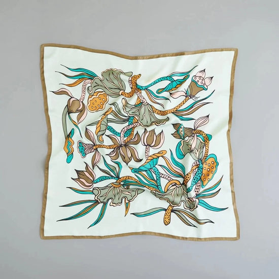 The traditional Vietnamese patterned silk scarf showcases folk tales, traditional artworks, or simply the diverse and colorful flora of Vietnam. The silk scarf is hand-dyed or printed using various roots and leaves (such as tropical almond leaves, turmeric roots, and brown roots) with a natural, warm, and gentle color palette that is environmentally friendly.
